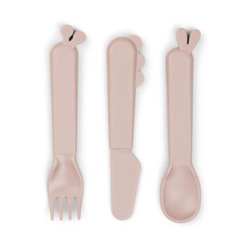 Das hübsche rosa Besteckset besteht aus einem Löffel mit Lalee-Ohren, einer Gabel mit Raffi-Ohren und einem Messer mit Croco-Schuppen. Es hat eine matte Oberfläche und passt perfekt zur restlichen Kiddish-Kollektion.