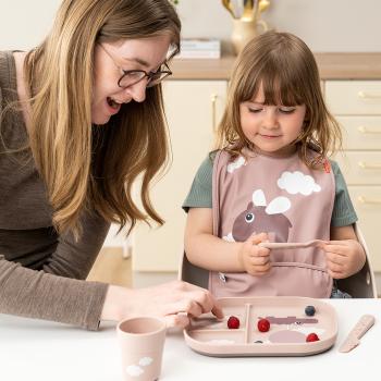 Auf dem rosa Foodie Minibecher ist ein hübsches Happy clouds Motiv mit Ozzo abgebildet, der fröhlich durch die Wolken fliegt. Seine matte Oberfläche passt perfekt zur restlichen Foodie-Kollektion.