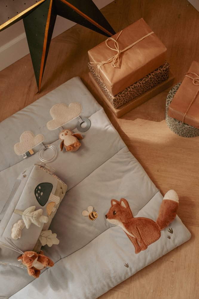Tauche ein in die Magie des Forest Friends auf dieser niedlichen blauen Spielmatte. Es gibt so viel zu entdecken und zu sehen! Begib dich auf ein Abenteuer, um das knisternde Blatt und die weichen Wolken zu finden, triff den lieben weichen Fuchs und spiele mit der Eule und dem Käfer. Es gibt auch einen kleinen Spiegel zur Selbstentdeckung und einen transparenten Ring mit drei Perlen, die rasseln, wenn sie sich bewegen. Diese gepolsterte Spielmatte mit verschiedenen Texturen und Aktivitäten stimuliert die Sinne und die Entwicklung deines Kindes.