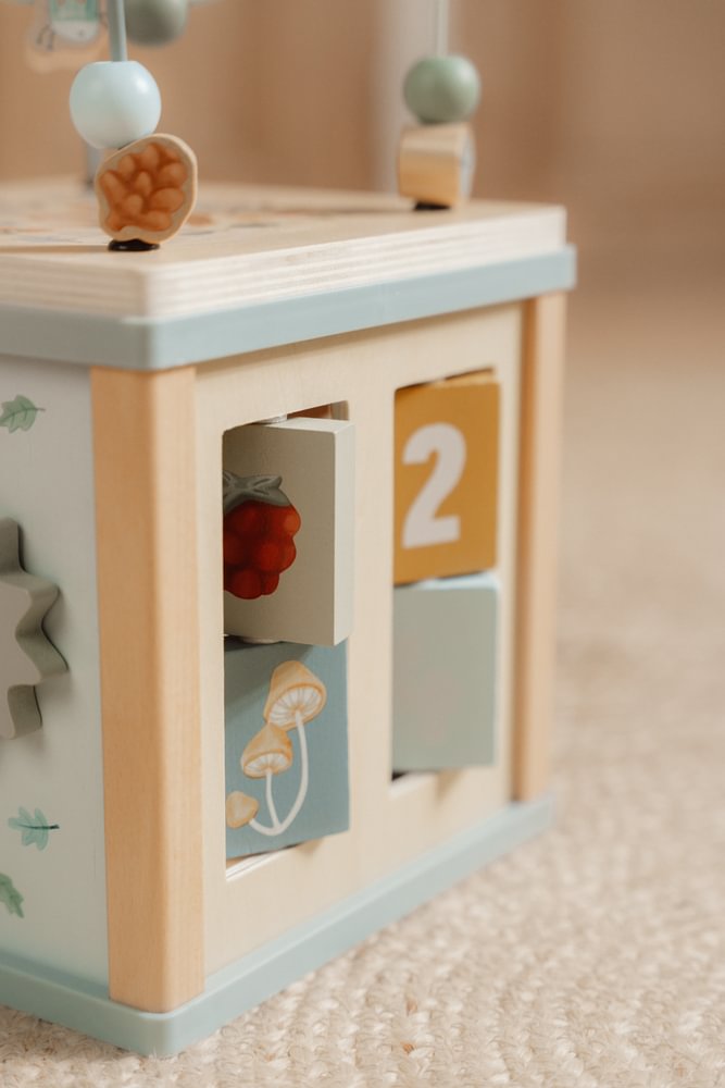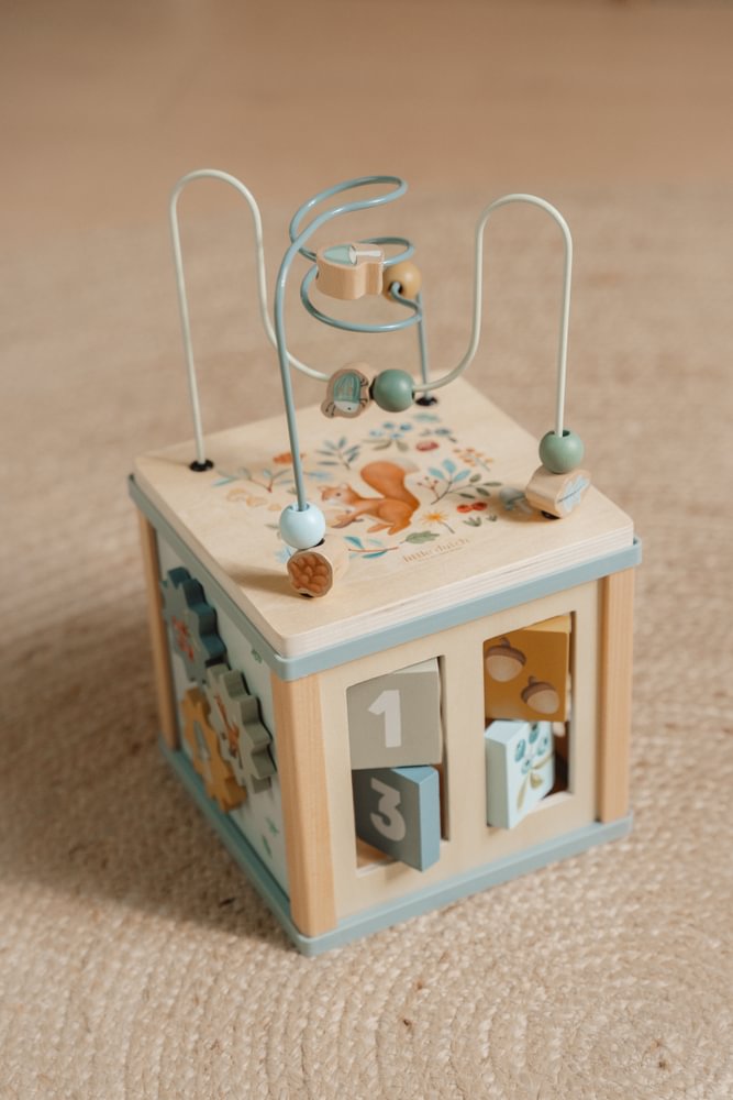 Entdecken Sie gemeinsam mit den Waldtieren die vielfältigen Spielmöglichkeiten des Little Dutch Aktivitätswürfels aus der Forest Friends Kollektion. Dieser robuste Holzwürfel bietet auf fünf Seiten spannende Lernaktivitäten wie einen Formensortierer, drehbare Zahnräder und bunte Schiebepuzzles, die gezielt die Feinmotorik und Hand-Augen-Koordination fördern. Das Highlight bildet das große Perlenlabyrinth auf der Oberseite, welches die Konzentration Ihres Kindes spielerisch herausfordert. In sanften Blautönen gestaltet, ist dieser Motorikwürfel das ideale Lernspielzeug für kleine Entdecker ab 18 Monaten, um Kreativität und Logik zu trainieren.