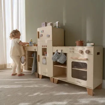 Kleine Köche aufgepasst! Diese wunderschöne Holzküche ist perfekt, um die leckersten Gerichte zuzubereiten. Backen Sie einen Kuchen im Ofen oder kochen Sie frisches Gemüse auf dem Herd. Das Set enthält zwei Töpfe, einen Topflappen und eine Ofenwand und ist mit Druckknöpfen mit Illustrationen für zusätzlichen Realismus ausgestattet. Kombinieren Sie die Küche mit dem Kühlschrank oder dem Waschmaschinen- und Geschirrspülerset, um eine komplette Spielküche zu schaffen. Was steht heute auf der Speisekarte?