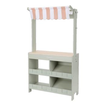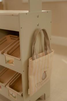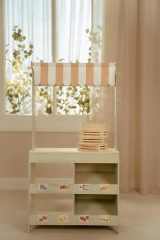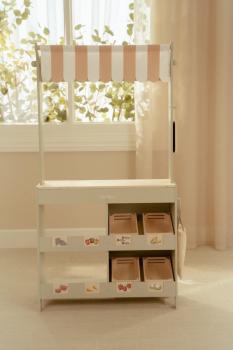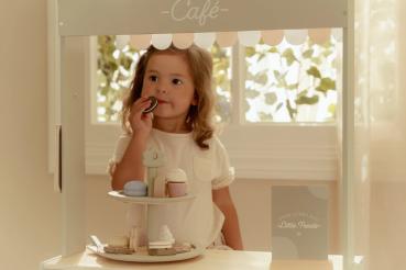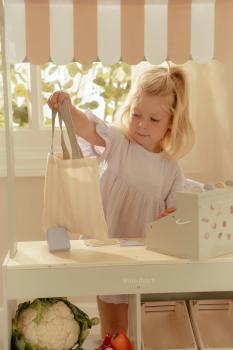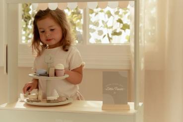 Mit diesem wunderschönen hölzernen Marktstand können Kinder ihren eigenen kleinen Laden eröffnen. Die Stoffmarkise sorgt für eine authentische Marktstimmung, und mit der Kreidetafel sowie den illustrierten Preisschildern lassen sich die Produkte schön präsentieren. Das Set enthält außerdem eine Einkaufstasche und Kisten für ein echtes Einkaufserlebnis. Dreht man den Marktstand um, wird er zu einem Café mit Speisekarte und fröhlichen Illustrationen. Kombiniere ihn mit der Kasse, der Waage oder einer Etagere mit Gebäck für noch mehr Spielspaß. Was steht heute auf der Speisekarte?
