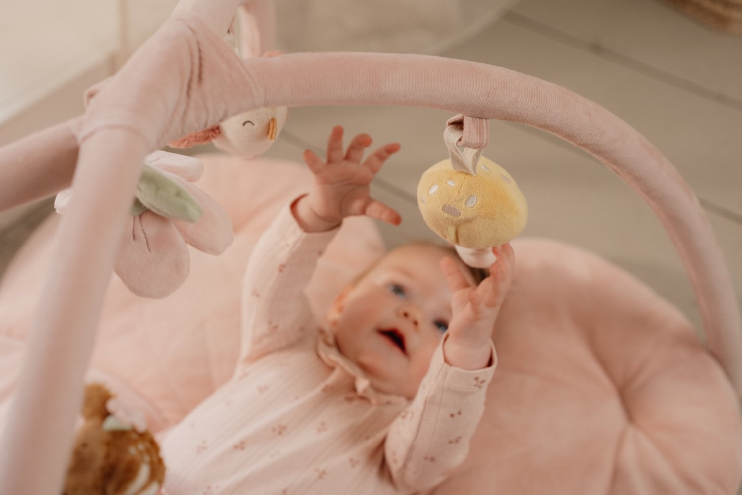 Mit der blumenförmigen Spielmatte aus der Fairy Garden Kollektion von Little Dutch wird das Liegen in der Bauch- oder Rückenlage zu einem magischen Erlebnis. Die weich gepolsterte Matte in sanftem Rosa verfügt über zwei stabile Kordbögen, an denen fünf liebevoll gestaltete Stofftiere baumeln: ein Reh, ein Vogel, eine Blume, ein Pilz und eine kleine Erdbeere. Diese animieren Ihr Baby zum Greifen und Entdecken, was gezielt die Hand-Augen-Koordination sowie die sensorischen Fähigkeiten fördert. Ein idealer Ort für erste spielerische Abenteuer, der Geborgenheit und visuelle Anreize perfekt kombiniert.