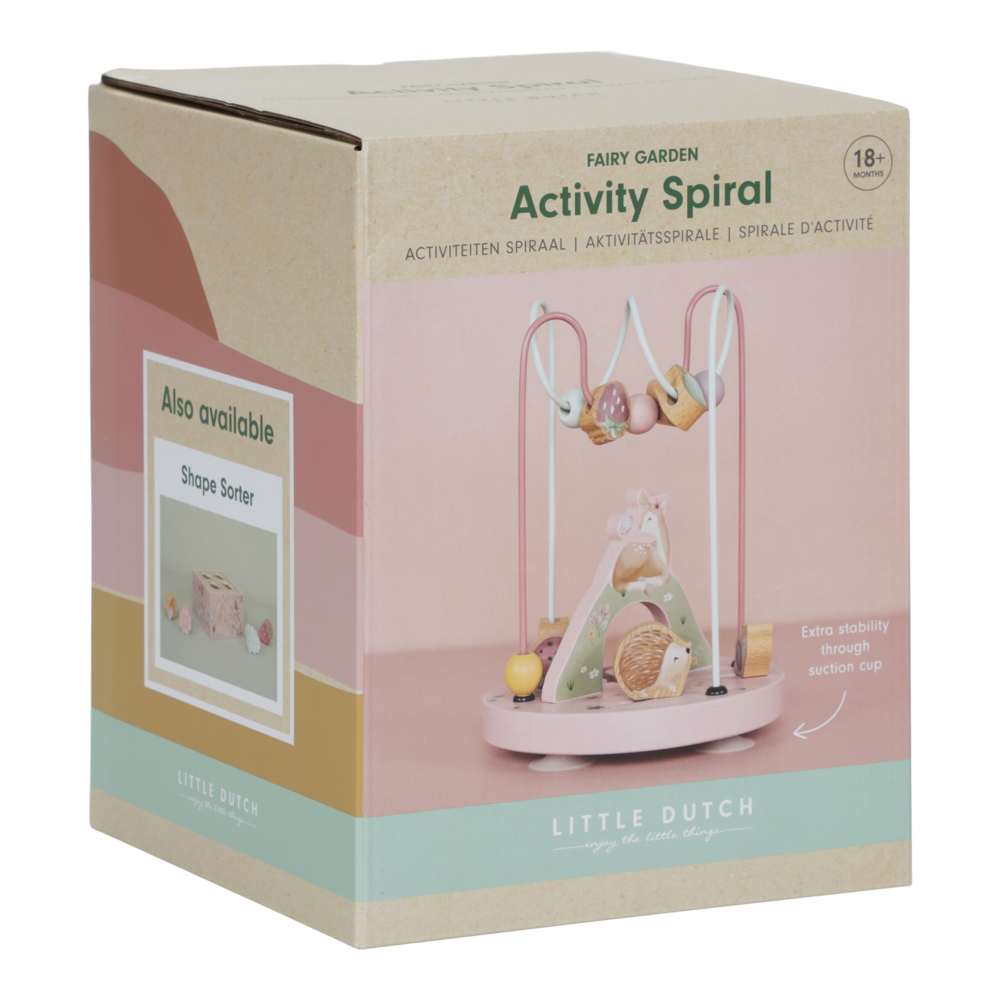 Die Little Dutch Aktivitätsspirale aus der Fairy Garden Kollektion lädt kleine Entdecker auf eine spielerische Reise durch eine magische Gartenwelt ein. Während Kinder die bunten Perlen und liebevoll gestalteten Figuren wie Reh, Igel und Schnecke über die Metallbahnen führen, wird spielerisch die Feinmotorik und Hand-Augen-Koordination trainiert. Das hochwertige Holzspielzeug ist mit charmanten Details wie blühenden Blumen und Erdbeeren verziert, die die Fantasie beflügeln und zum Verweilen einladen. Dank der robusten Bauweise und der kindgerechten Gestaltung bietet dieses Motorik-Labyrinth ein lehrreiches und bezauberndes Erlebnis für Kinder ab 18 Monaten.