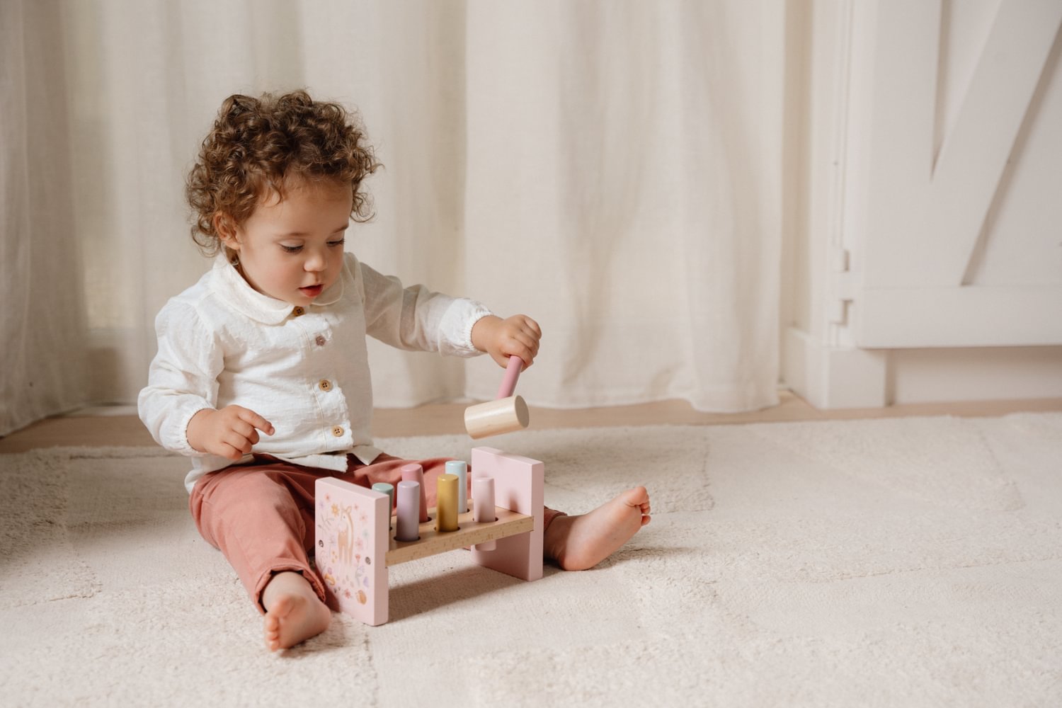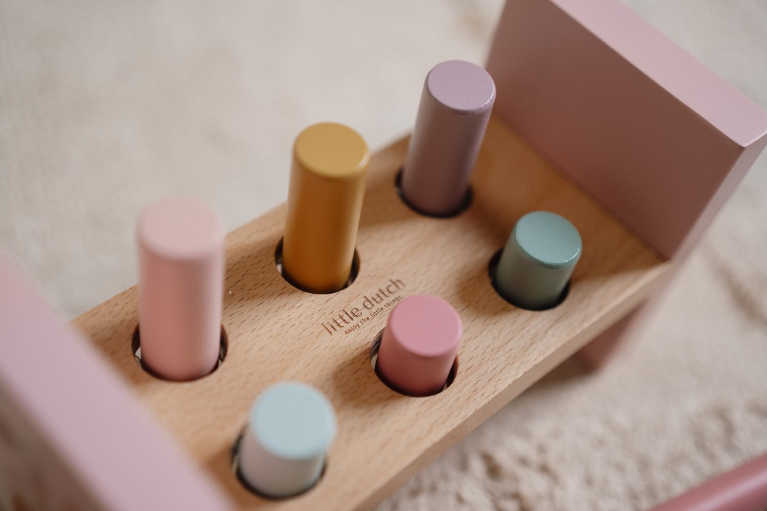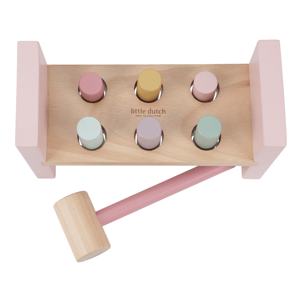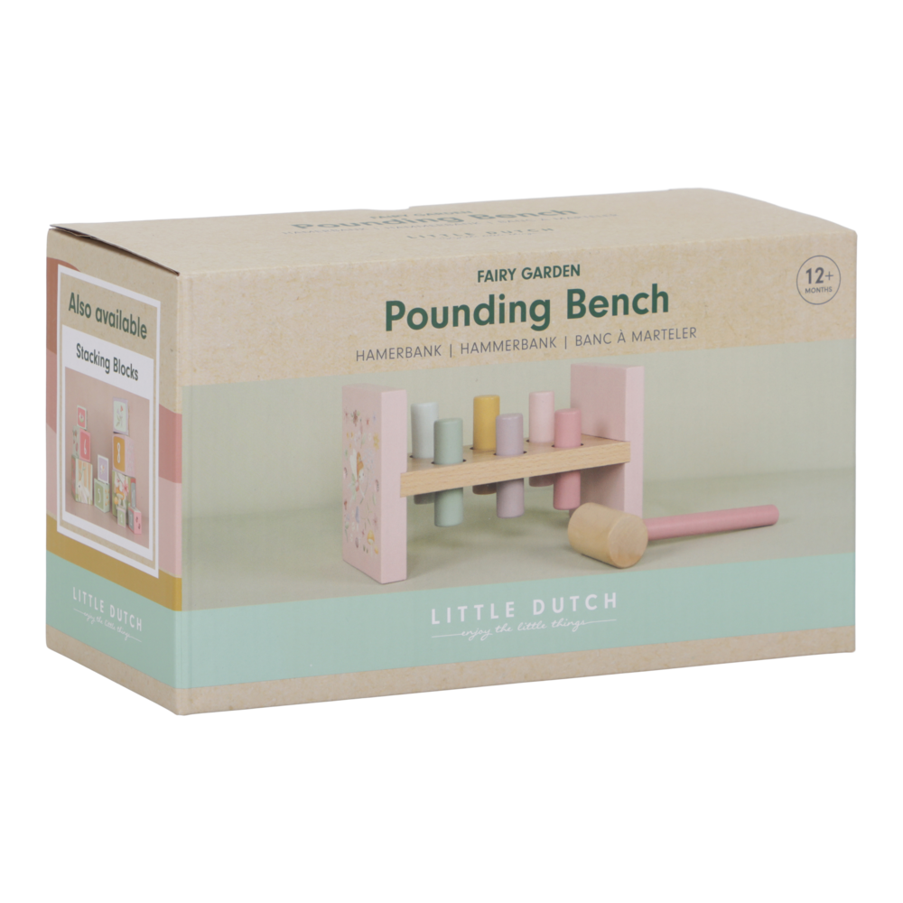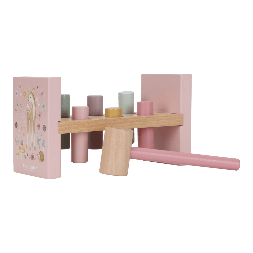 Tap, Tap, Tap! Mit der zauberhaften Hammerbank aus der Fairy Garden Kollektion von Little Dutch können kleine Handwerker spielerisch ihre Geschicklichkeit unter Beweis stellen. Das Set enthält sechs farbige Holzpflöcke, die mit dem passenden Hammer in die Bank geklopft werden – ein riesiger Spaß, der ganz nebenbei die Feinmotorik und die Hand-Augen-Koordination fördert. Sobald alle Pflöcke versenkt sind, wird die Bank einfach umgedreht, und das Abenteuer beginnt von vorn.
