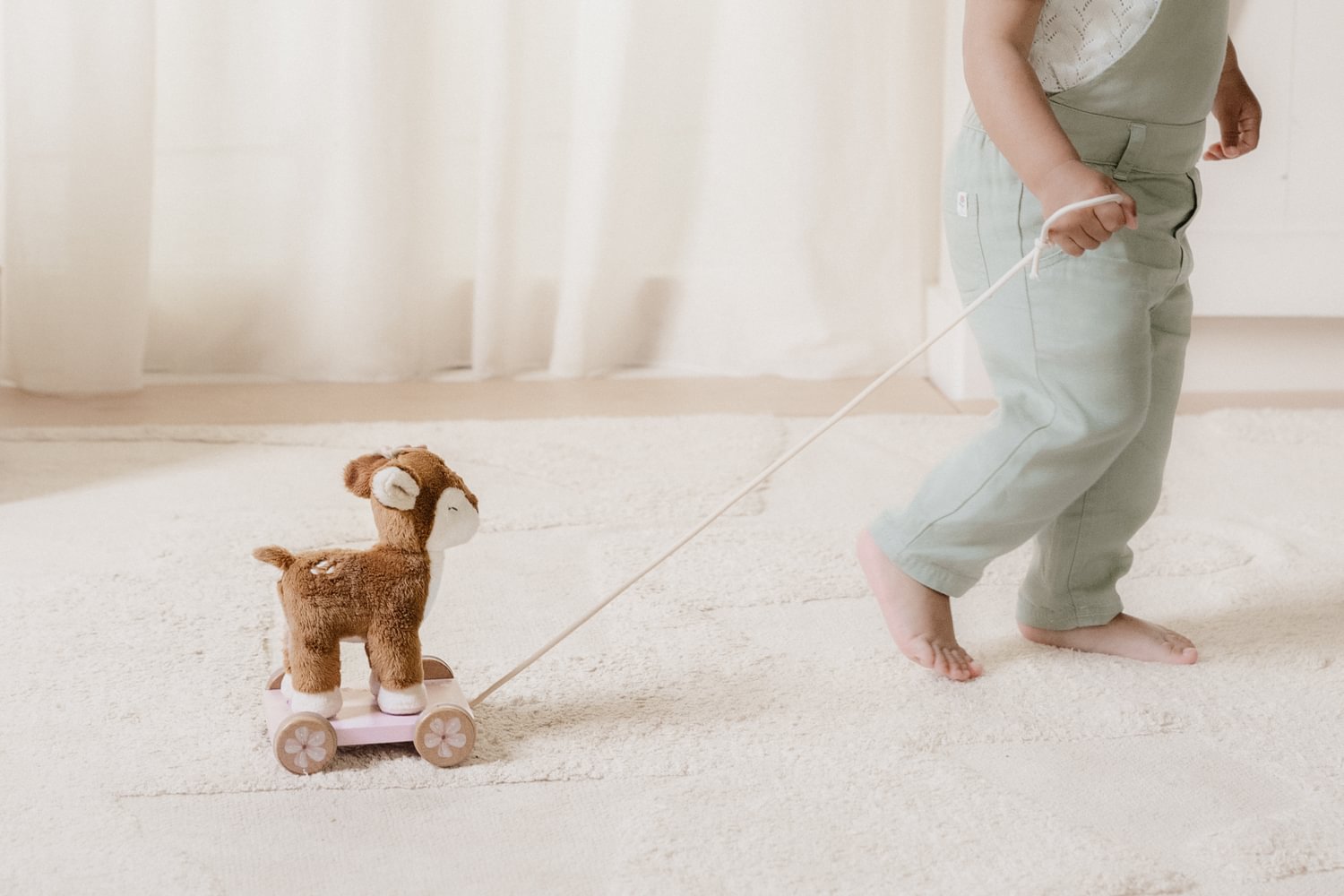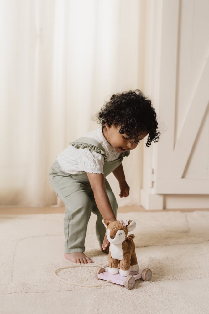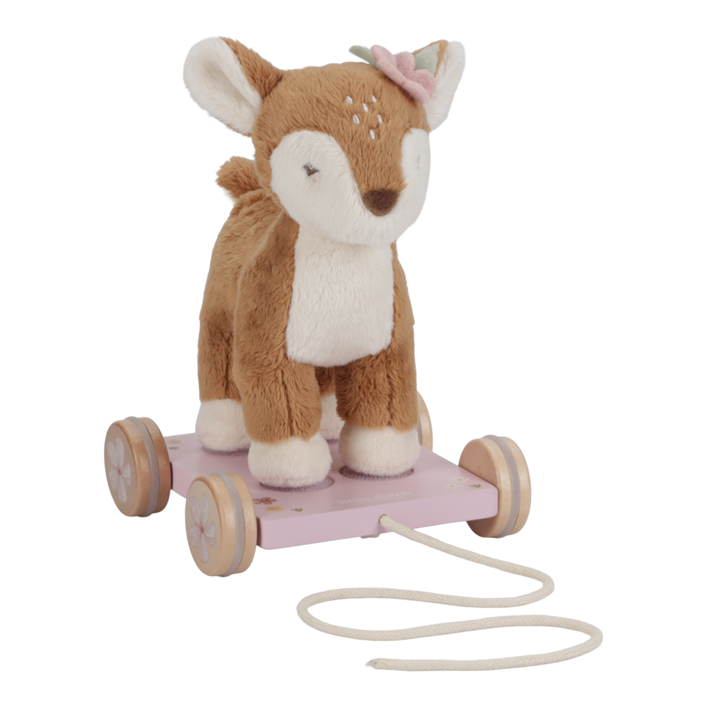 Nimm das Reh mit! Ziehen Sie am Seil und begeben Sie sich gemeinsam auf ein Abenteuer. Das Reh folgt dir durch den magischen Feengarten, in dem die schönsten Blumen wachsen und kleine Feen singen und tanzen. Der weiche und kuschelige Hirsch dieses Nachziehspielzeugs steht auf einem rosafarbenen, blumengeschmückten Holzwagen. Mit der kleinen Schnur kann Ihr Kind es durch das Haus führen und spielen. Ein niedliches Spielzeug, das zum Laufen anregt und die motorischen Fähigkeiten fördert.
