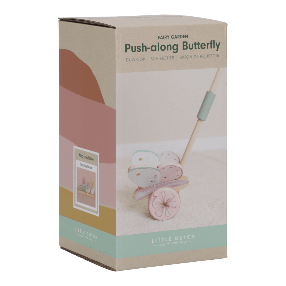Liebevoll gestaltetes Schiebetier aus Holz in Form eines Schmetterlings aus der Fairy-Garden-Kollektion. Beim Schieben bewegen sich die Flügel auf und ab und sorgen für spielerische Begeisterung. Das Spielzeug unterstützt Kinder beim Laufenlernen und fördert die motorische Entwicklung. Robuste Gummiräder ermöglichen leises, bodenschonendes Spielen im Haus.