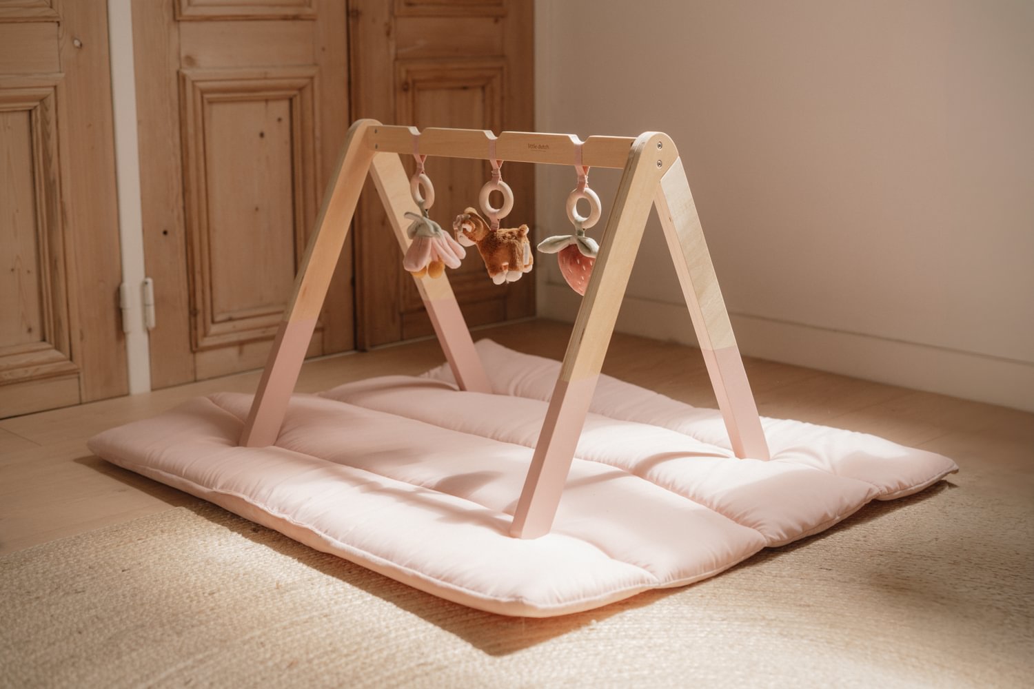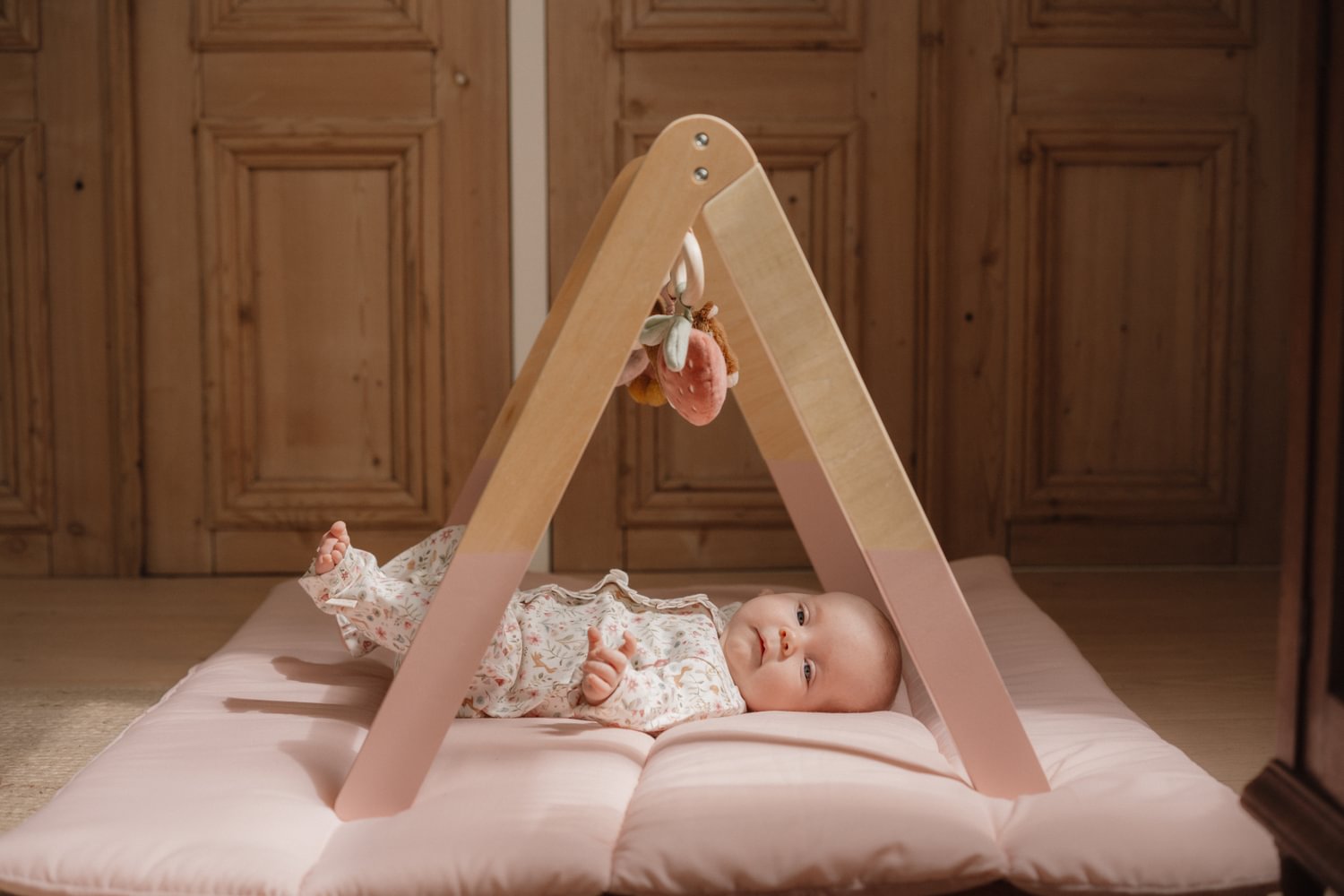Das rosa Spieltrapez aus Holz von Little Dutch aus der Fairy-Garden-Kollektion lädt Babys zum Greifen, Staunen und Entdecken ein. Drei liebevoll gestaltete Aktivitätsspielzeuge – Reh, Blume und Erdbeere – sorgen für abwechslungsreiche Unterhaltung. Beim Ausstrecken der Arme werden Hand-Auge-Koordination, Motorik und sensorische Wahrnehmung spielerisch gefördert. Ein hochwertiges Baby-Gym für ruhige Spielmomente in den ersten Lebensmonaten.