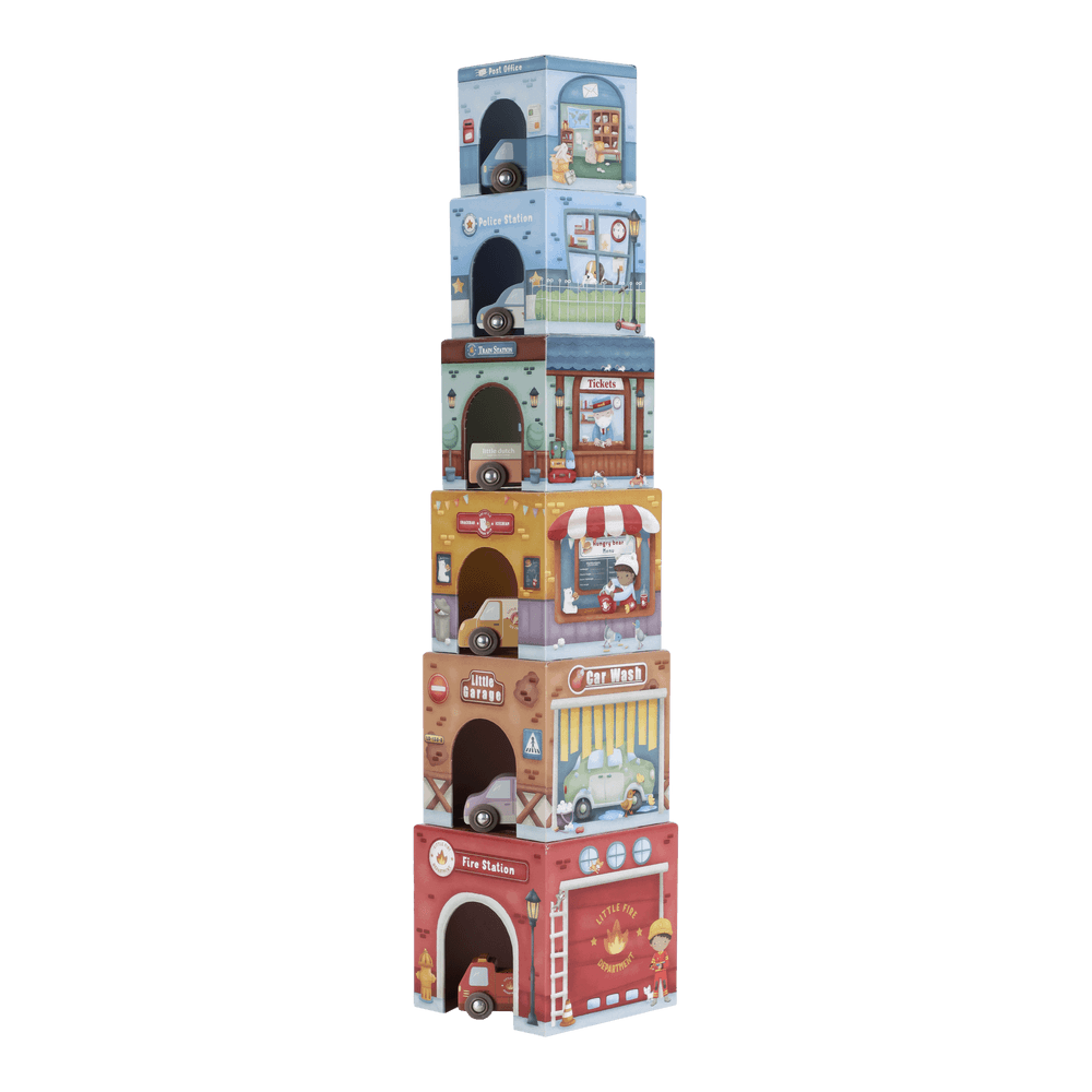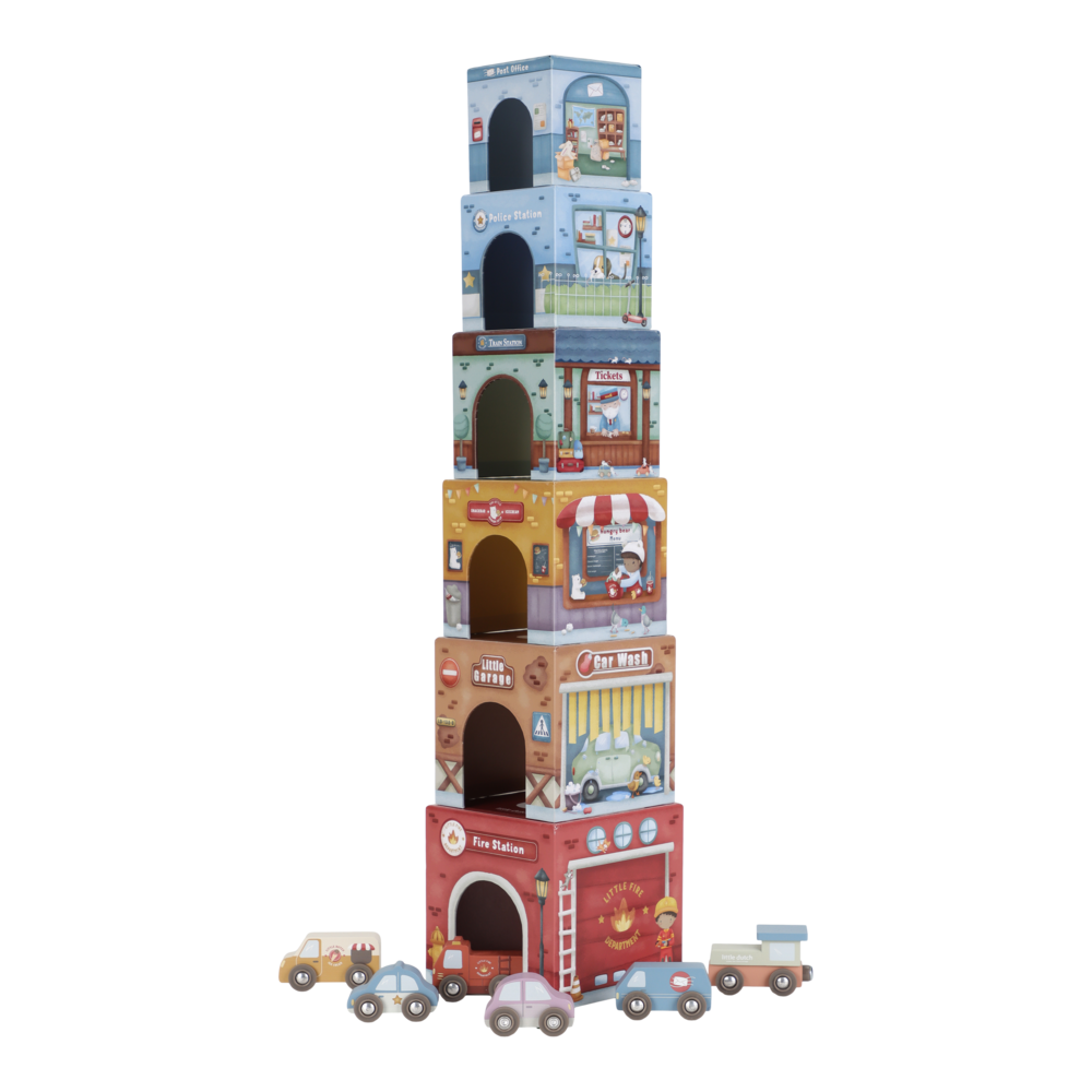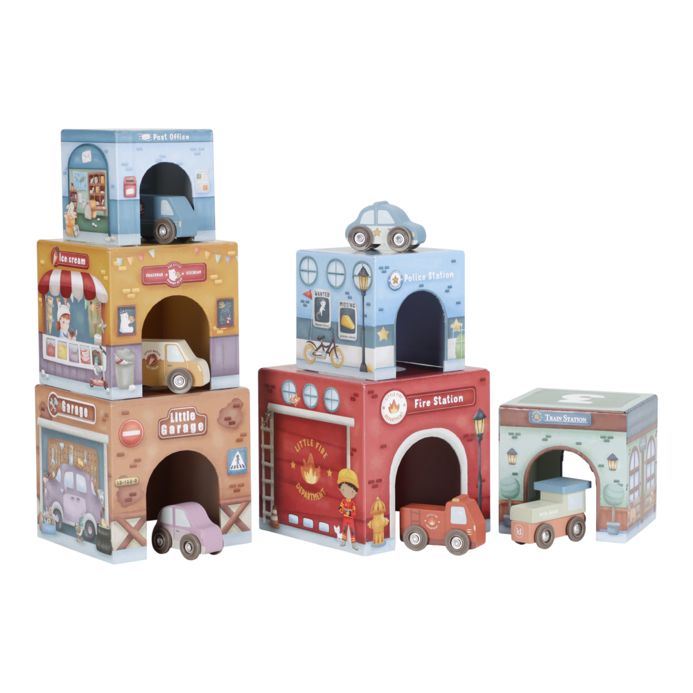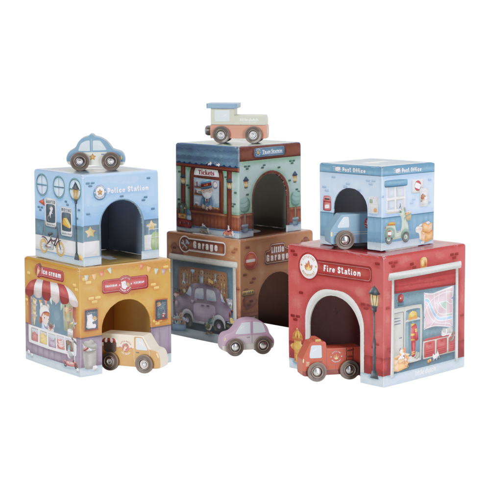 Die Little Dutch Stapelblöcke mit passenden Fahrzeugen laden zum Stapeln, Bauen und Entdecken ein. Das Set besteht aus sechs liebevoll illustrierten Kartonwürfeln, die jeweils mit einem eigenen Holzauto kombiniert sind. Die Blöcke lassen sich übereinander stapeln oder so anordnen, dass die Fahrzeuge darunter hindurchfahren können. Spielerisch werden Fantasie, Motorik und räumliches Denken gefördert.