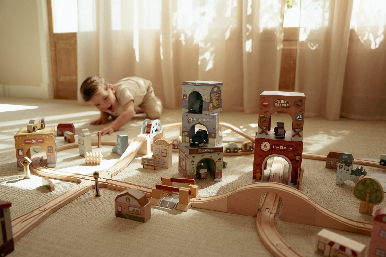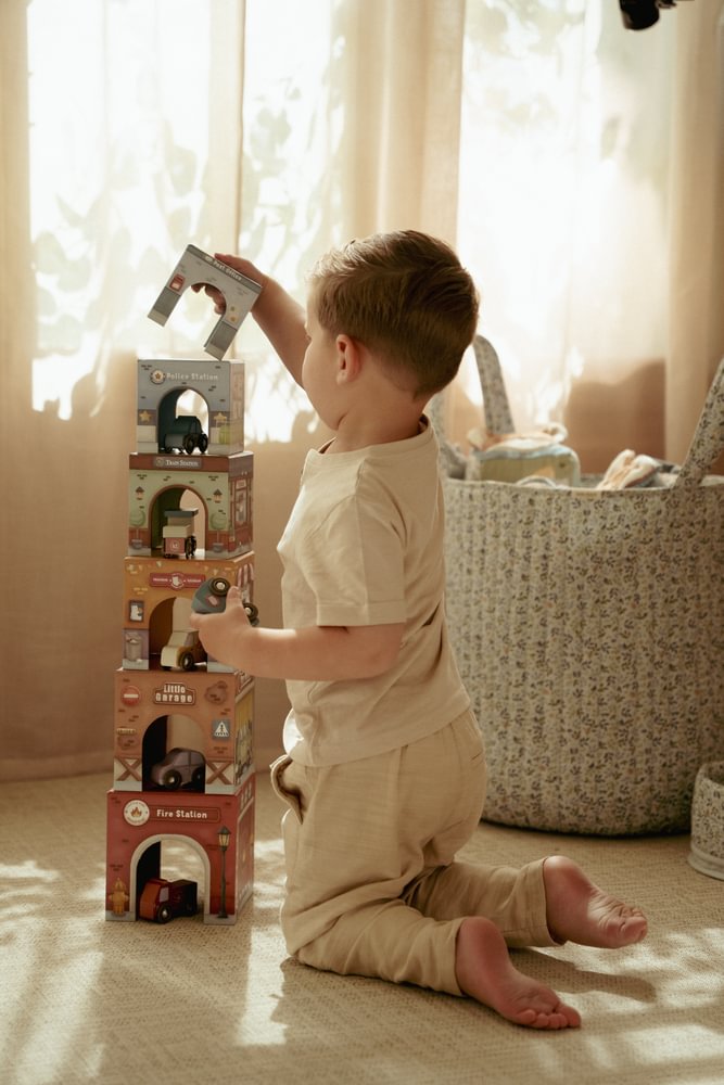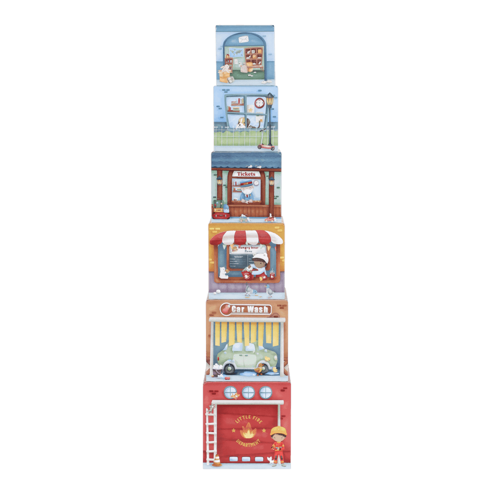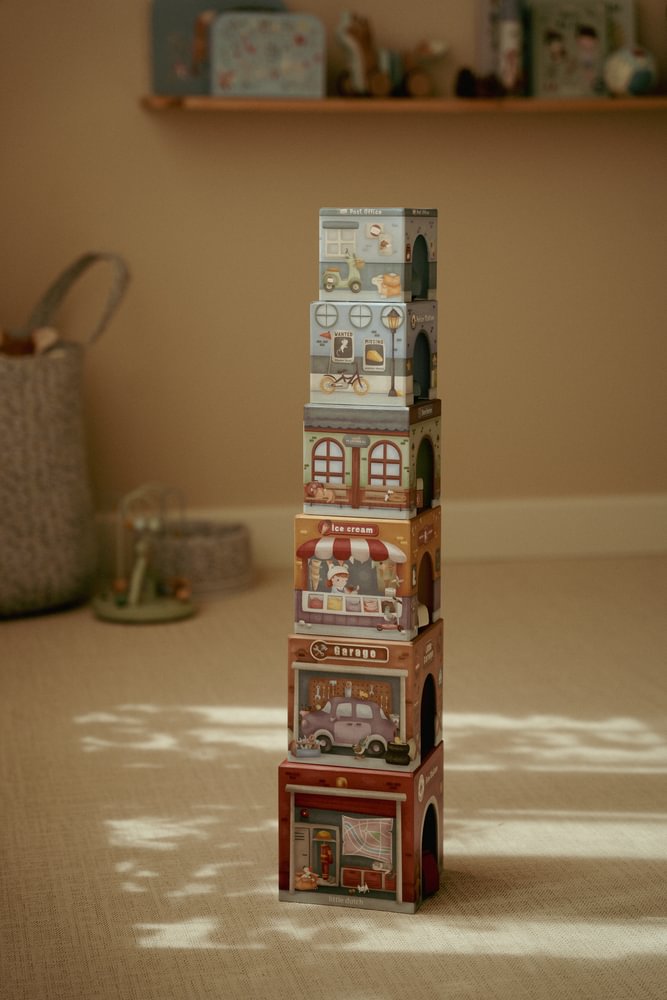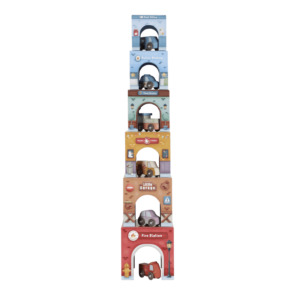 Die Little Dutch Stapelblöcke mit passenden Fahrzeugen laden zum Stapeln, Bauen und Entdecken ein. Das Set besteht aus sechs liebevoll illustrierten Kartonwürfeln, die jeweils mit einem eigenen Holzauto kombiniert sind. Die Blöcke lassen sich übereinander stapeln oder so anordnen, dass die Fahrzeuge darunter hindurchfahren können. Spielerisch werden Fantasie, Motorik und räumliches Denken gefördert.
