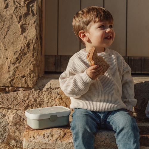 Diese praktische Brotdose im süßen Little Farm Design von Little Dutch kommt mit einem herausnehmbaren Bento-Einsatz und einer Snackgabel. So wird Abwechslung beim Pausenbrot zum Kinderspiel und dank des Bento-Einsatzes bleiben alle Zutaten ordentlich voneinander getrennt, sodass sie frisch und lecker bleiben. Wird der flexible Einsatz entfernt, bietet die Brotdose Platz für bis zu vier Butterbrote. Nach dem Gebrauch kann sowohl die Brotdose als auch der Bento-Einsatz ganz einfach in der Spülmaschine gereinigt werden. Der praktische Verschluss bietet ein kinderleichtes Öffnen und Verschließen der Brotdose.