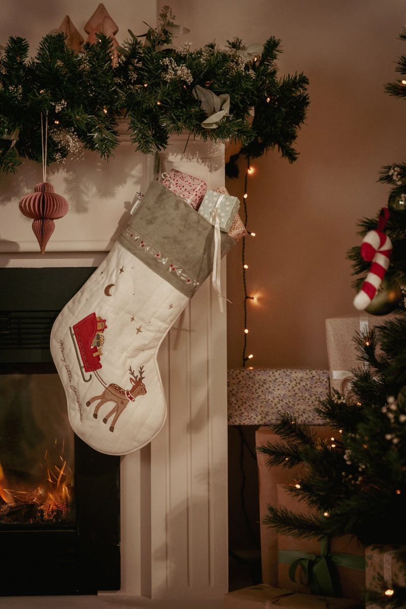 Diese gesteppte Weihnachtssocke in festlichem Grün ist ein echter Blickfang in der Weihnachtszeit. Sie ist mit feinen Stickereien verziert – darunter ein Rentier mit Schlitten und Geschenken sowie ein Mond mit funkelnden Sternen. Das zeitlose Design passt perfekt zu einer ruhigen, natürlichen Weihnachtsatmosphäre. Einfach an Kamin, Tür oder Bett hängen und mit kleinen Überraschungen oder lieben Grüßen füllen. Eine wunderbare Ergänzung für deine Weihnachtsdekoration, an der du jedes Jahr wieder Freude hast.