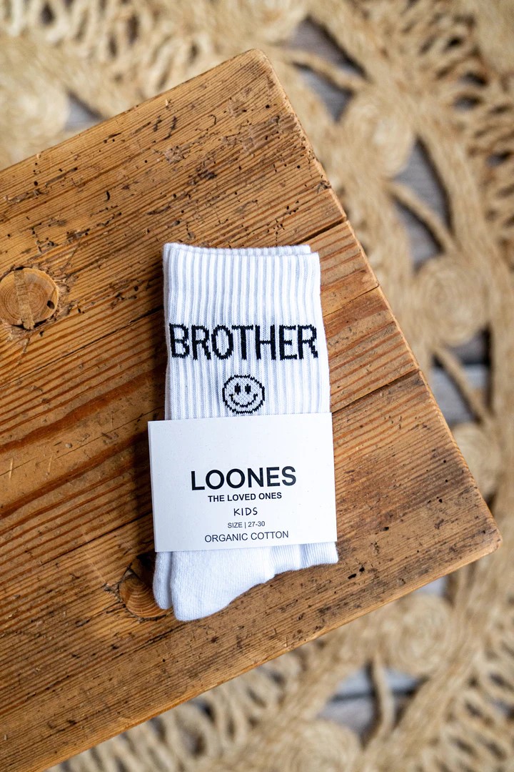 Premiumsocken in weiss aus kuschelig-weicher Bio Baumwolle mit eingewebtem Schriftzug BROTHER und einem happy Smiley jeweils an der Außenseite.